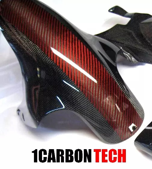 FULL CARBON FIBER FRONT FENDER MUDGUARD WITH RED KEVLAR TOP.